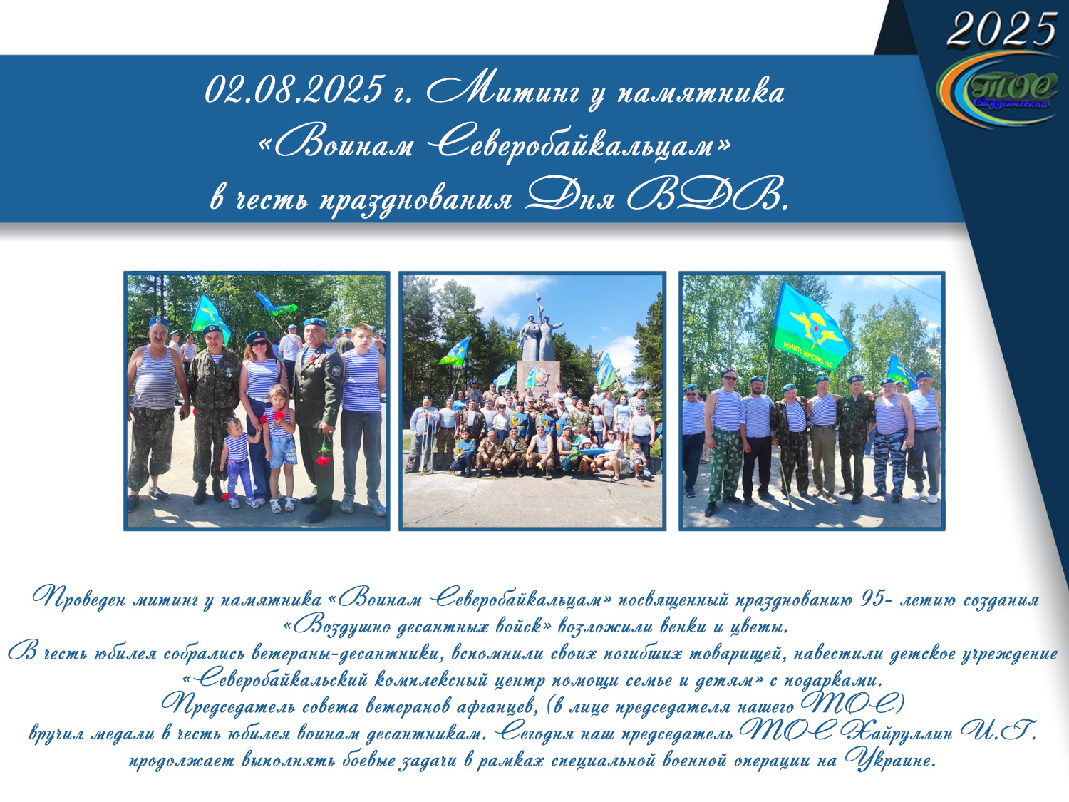 Проведен митинг у памятника «Воинам Северобайкальцам» посвященный празднованию 95- летию создания «Воздушно десантных войск» возложили венки и цветы. В честь юбилея собрались ветераны-десантники, вспомнили своих погибших товарищей, навестили детское учреждение «Северобайкальский комплексный центр помощи семье и детям» с подарками. Председатель совета ветеранов афганцев,