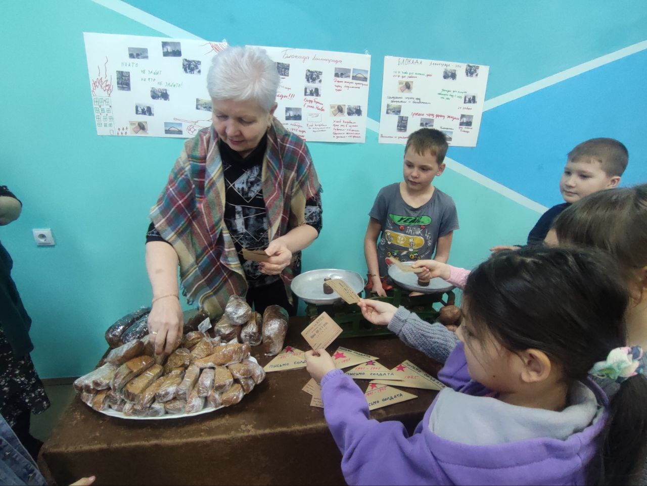 Затем все присутствующие по карточкам смогли получить кусочек того самого блокадного хлеба, который предварительно был взвешан.