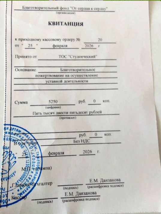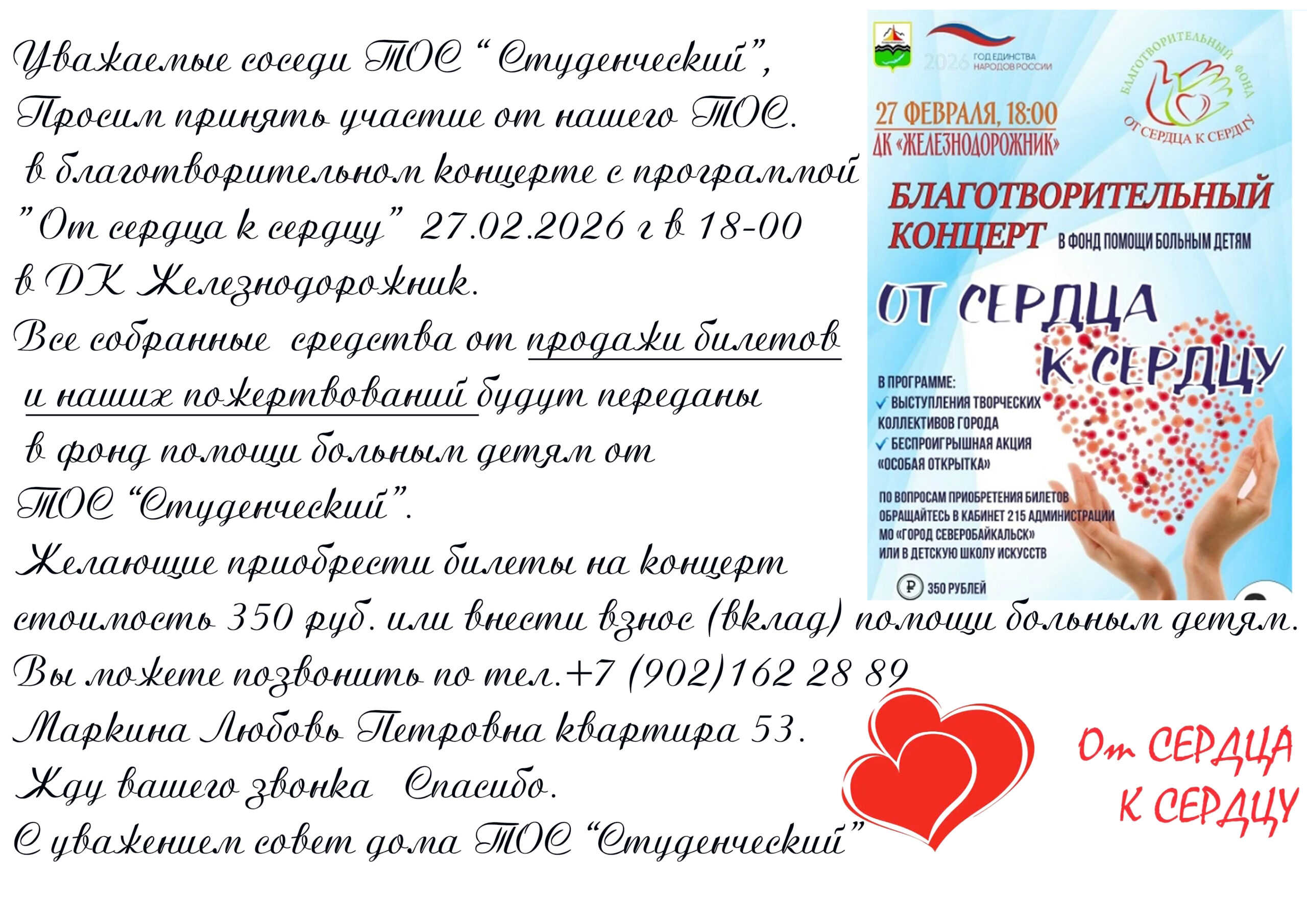 27.02.2026 г.В ДК “Железнодорожник” состоялся благотворительный концерт” От сердца к сердцу”, вырученные средства от продажи билетов пойдут на помощь больным детям, с проблемами здоровья. Поделиться добром и теплом с детьми пришли и наши жители МКД, приобрели 11 билетов на концерт и оказали помощь,внесли 5250 руб. (всего 9100 руб).