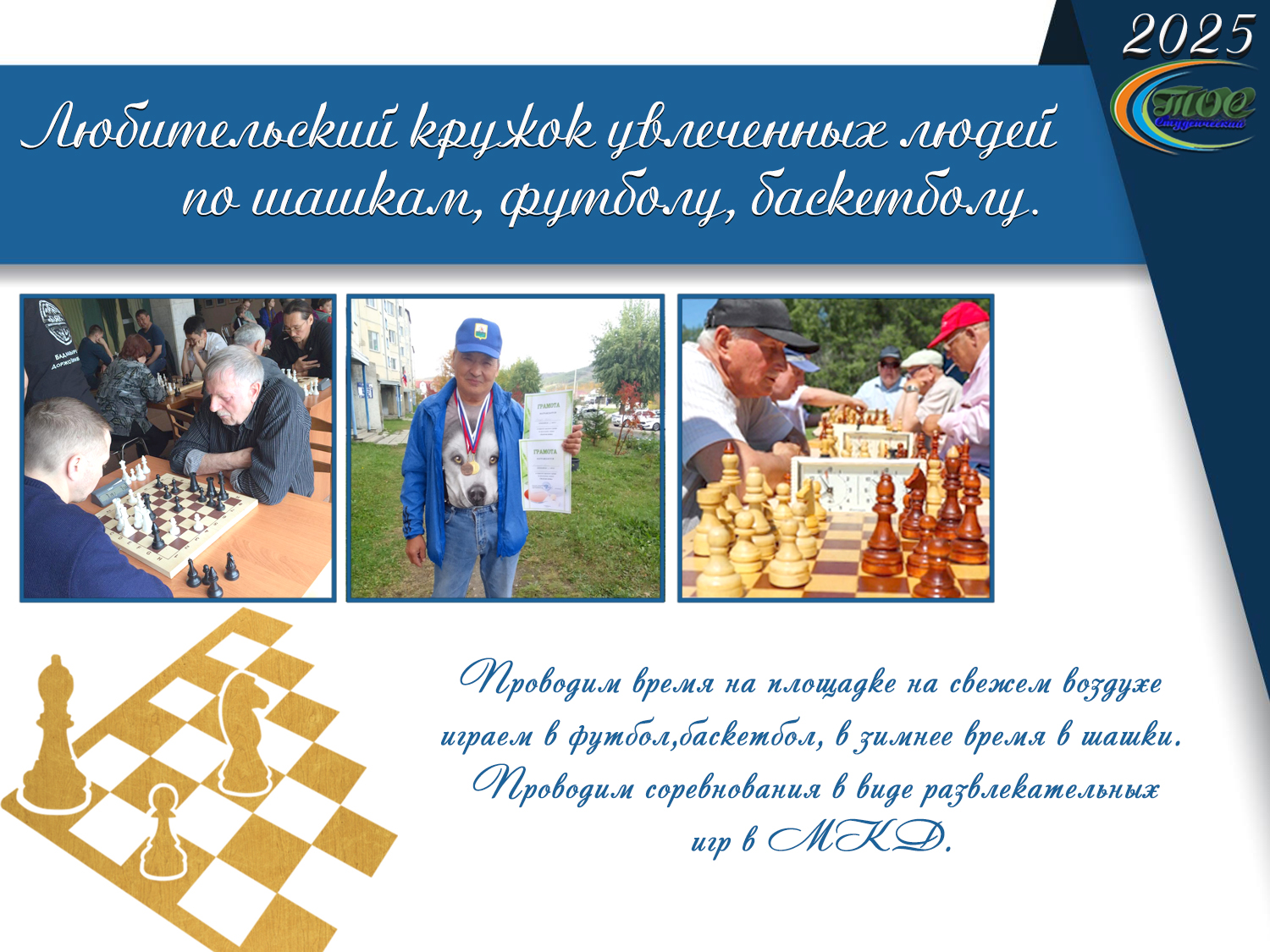 При ТОС есть любительский кружок увлеченных людей по шашкам, футболу, баскетболу. Проводим время на площадке на свежем воздухе играем в футбол, баскетбол, в зимнее время в шашки. Проводим соревнования в виде развлекательных игр в МКД.