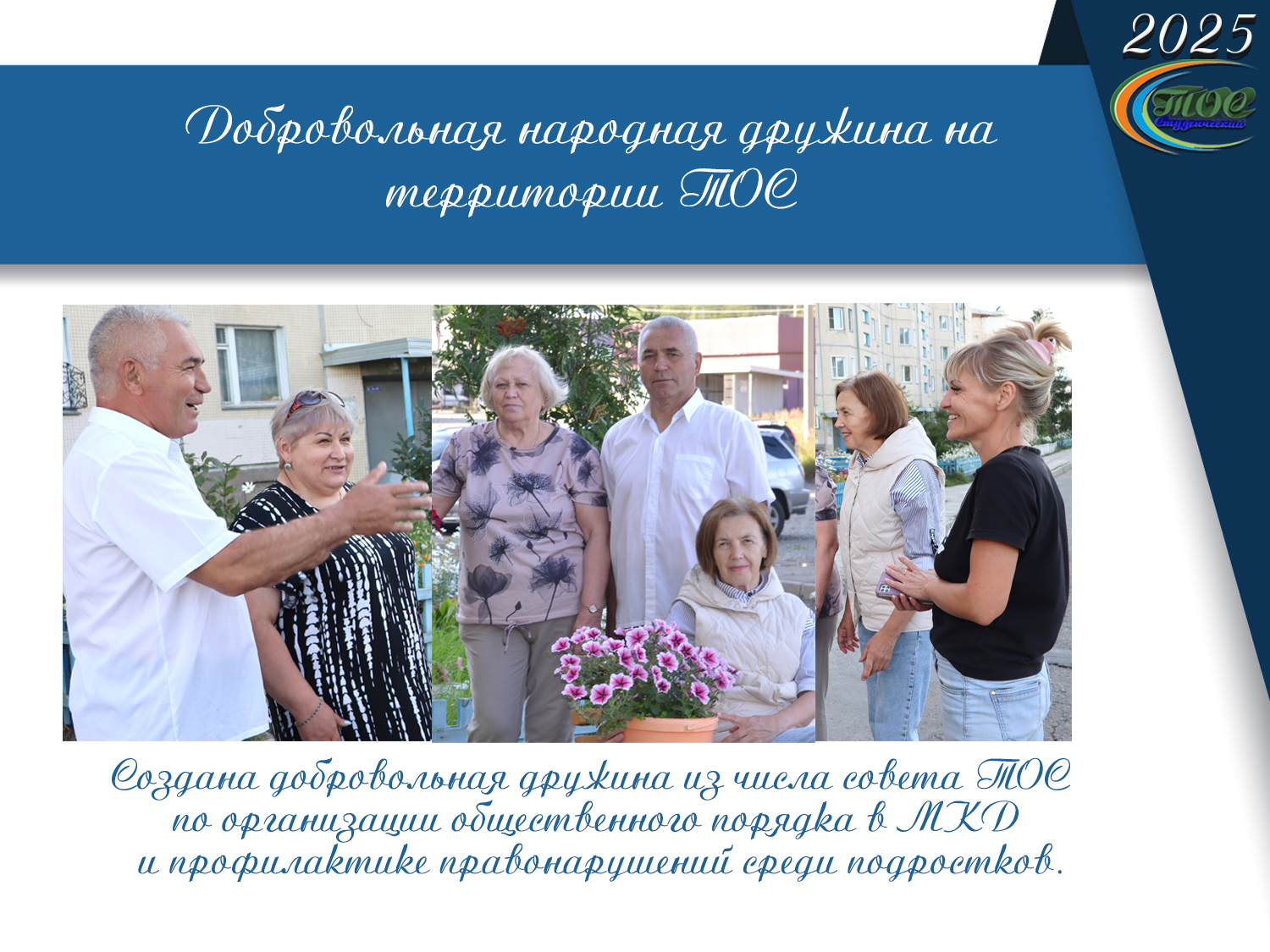 Создана добровольная дружина из числа совета ТОС по организации общественного порядка в МКД и профилактике правонарушений среди подростков.
