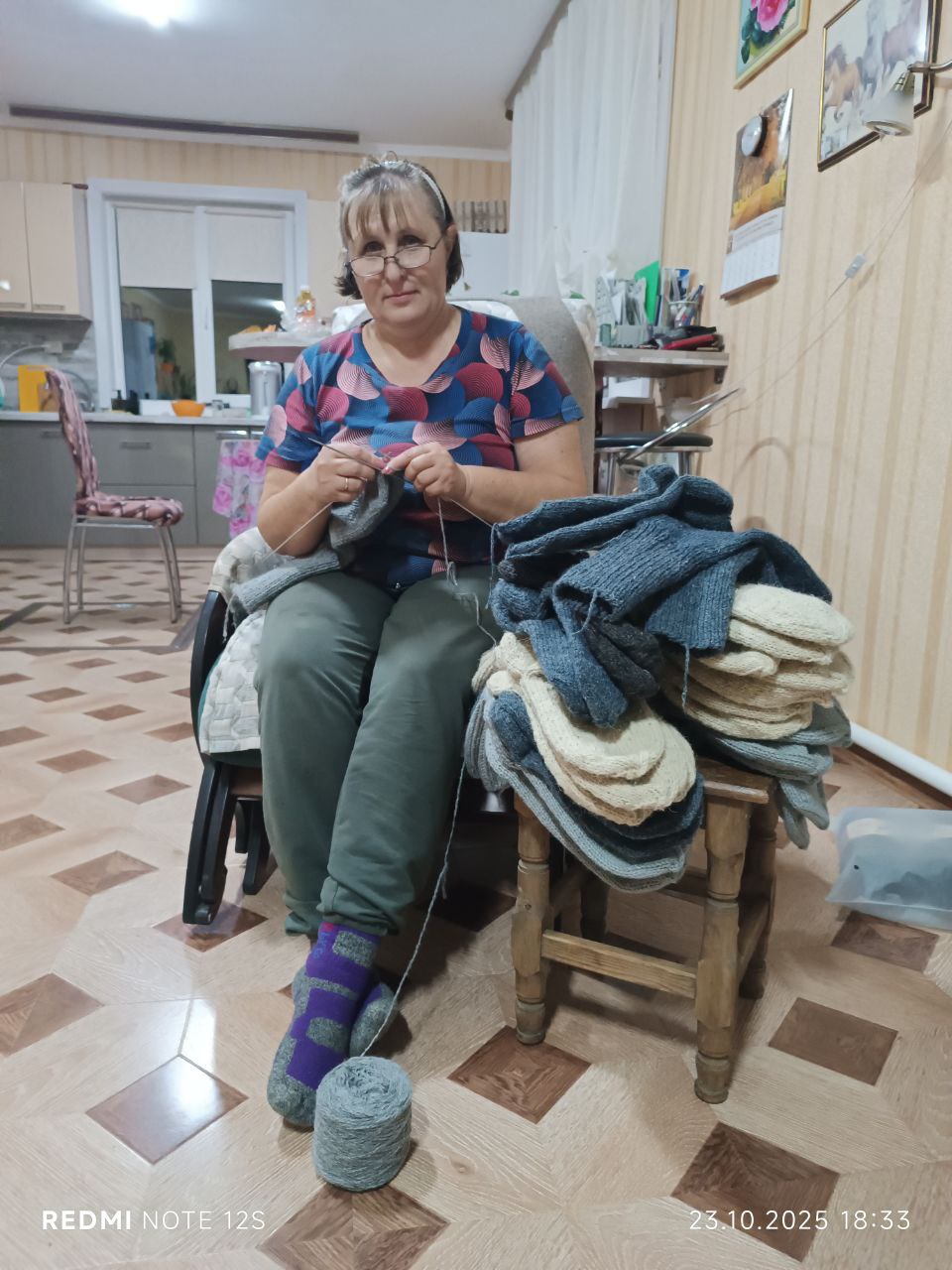 Для бойцов вяжем носочки по 25 пар в месяц. Шерсть стараемся взять 50% шерсти и 50% синтетики. В таких носках и ноге тепло и дольше носятся . И наши бойцы чувствуют заботу. Тепло наших рук.