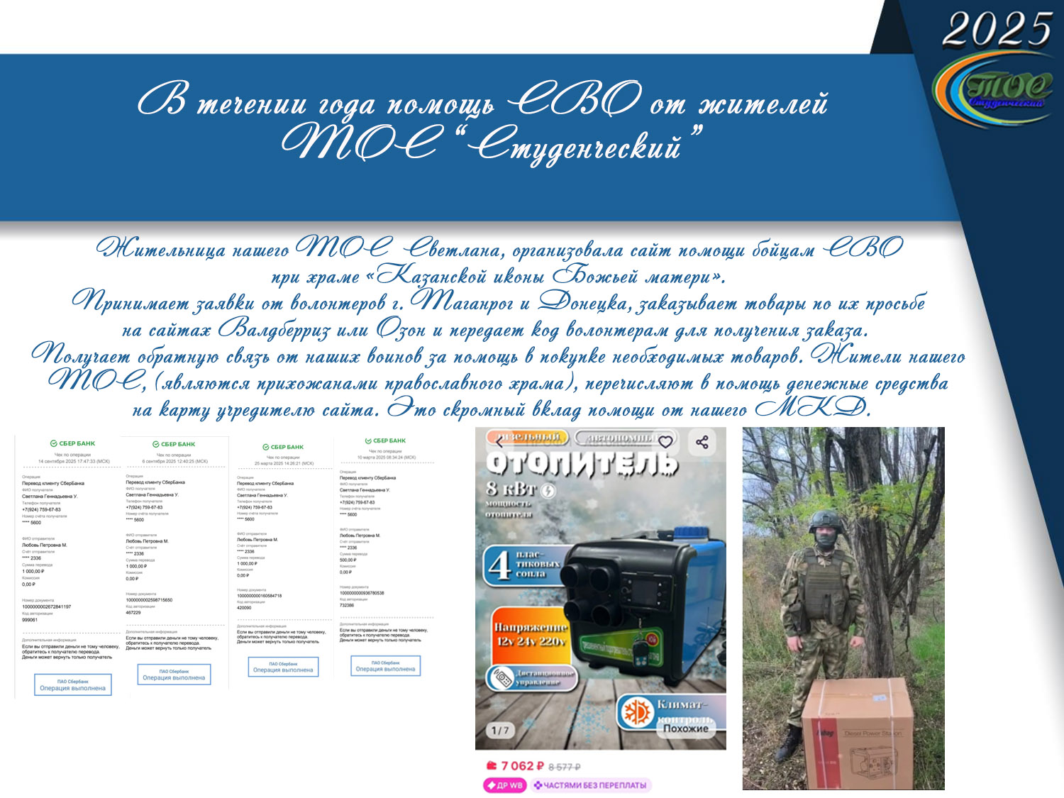 В течении года помощь СВО. Жительница нашего ТОС Светлана, организовала сайт помощи бойцам СВО при храме «Казанской иконы Божьей матери». Принимает заявки от волонтеров г. Таганрог и Донецка, заказывает товары по их просьбе на сайтах Валдбериз или Озон и передает код волонтерам для получения заказа. Получает обратную связь от наших воинов за помощь в покупке необходимых товаров. Жители нашего ТОС, (являются прихожанами православного храма), перечисляют в помощь денежные средства, на карту учредителю сайта. Это скромный вклад помощи от нашего МКД.